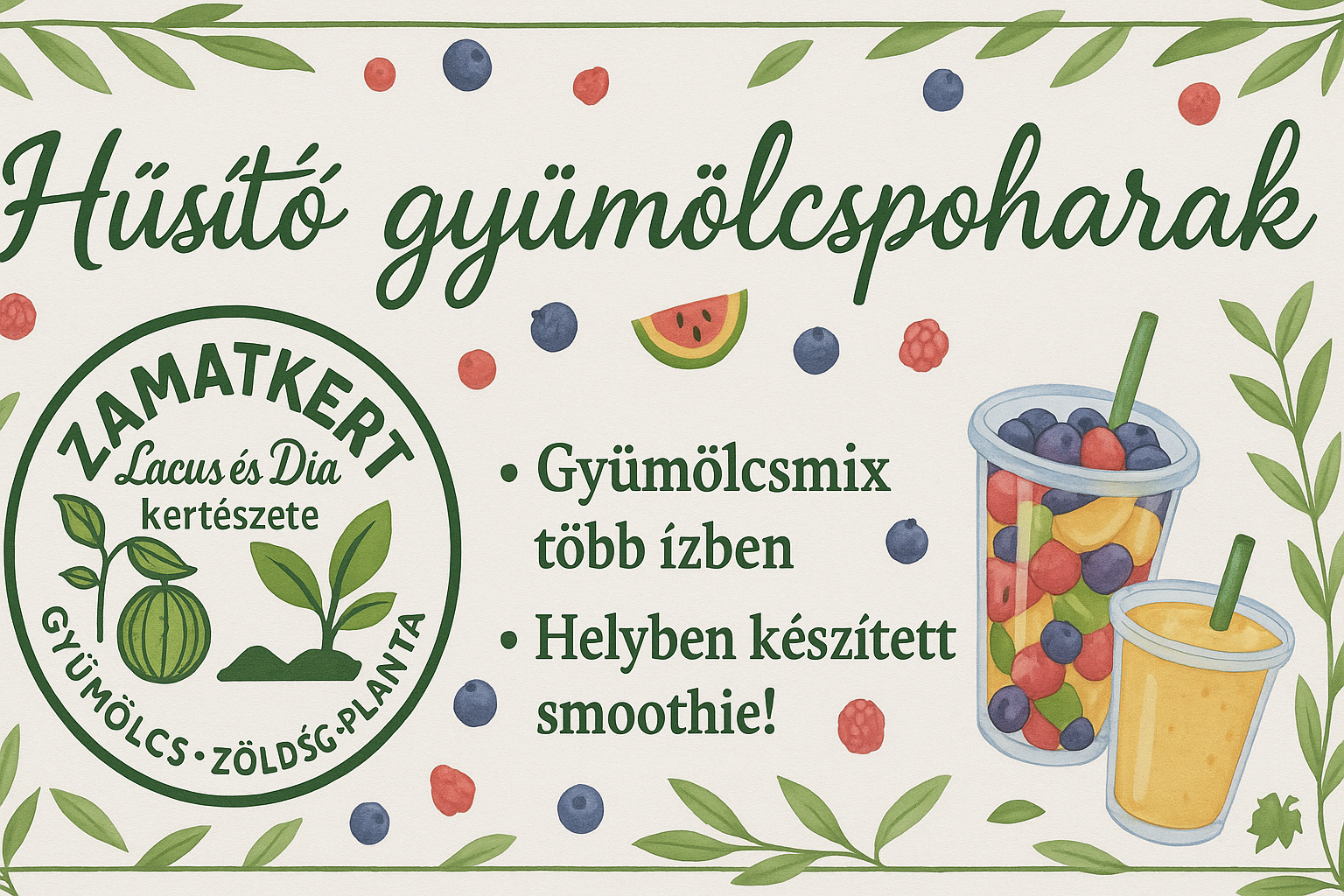 Zamatkertként már évek óta foglalkozunk gyümölcs- és zöldségtermesztéssel Nagykereki régiójában.Termékeink csakis kizárólag saját, valamint hazai termelők által gondosan válogatott minőségi gyümölcseikből készülnek. Gyümölcs mixeink 300 és 500 ml -es shakerpohárba, lehűtve kínáljuk akár különböző ízű öntettel, vagy helyszínen frissen túrmixolva, fűszerezve smothiekènt! Mixeink nem tartalmaznak hozzáadott cukrot, szinezèket, tartósítószert.Baba barát termèkünk kisbabák számára is fogyasztható, ezt mosolygó baba ikon jelzi a mix név mellet.